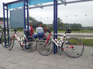 Bij aankomst bij de IJsselbrug zie ik nog geen Swollanders en besluit nog een extra rondje te fietsen en bij mijn tweede aankomst zitten Ruud W. en Arnold van B. gebroederlijk naast elkaar in het bushokje.