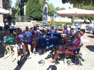 Op het terras zitten Diny en Annemiek samen met de beide ATB-ers Gerjan en Wim te relaxen in de schaduw. Als wij er bij zijn gaan zitten komt de rest in twee gedeelten terug bij het hotel.