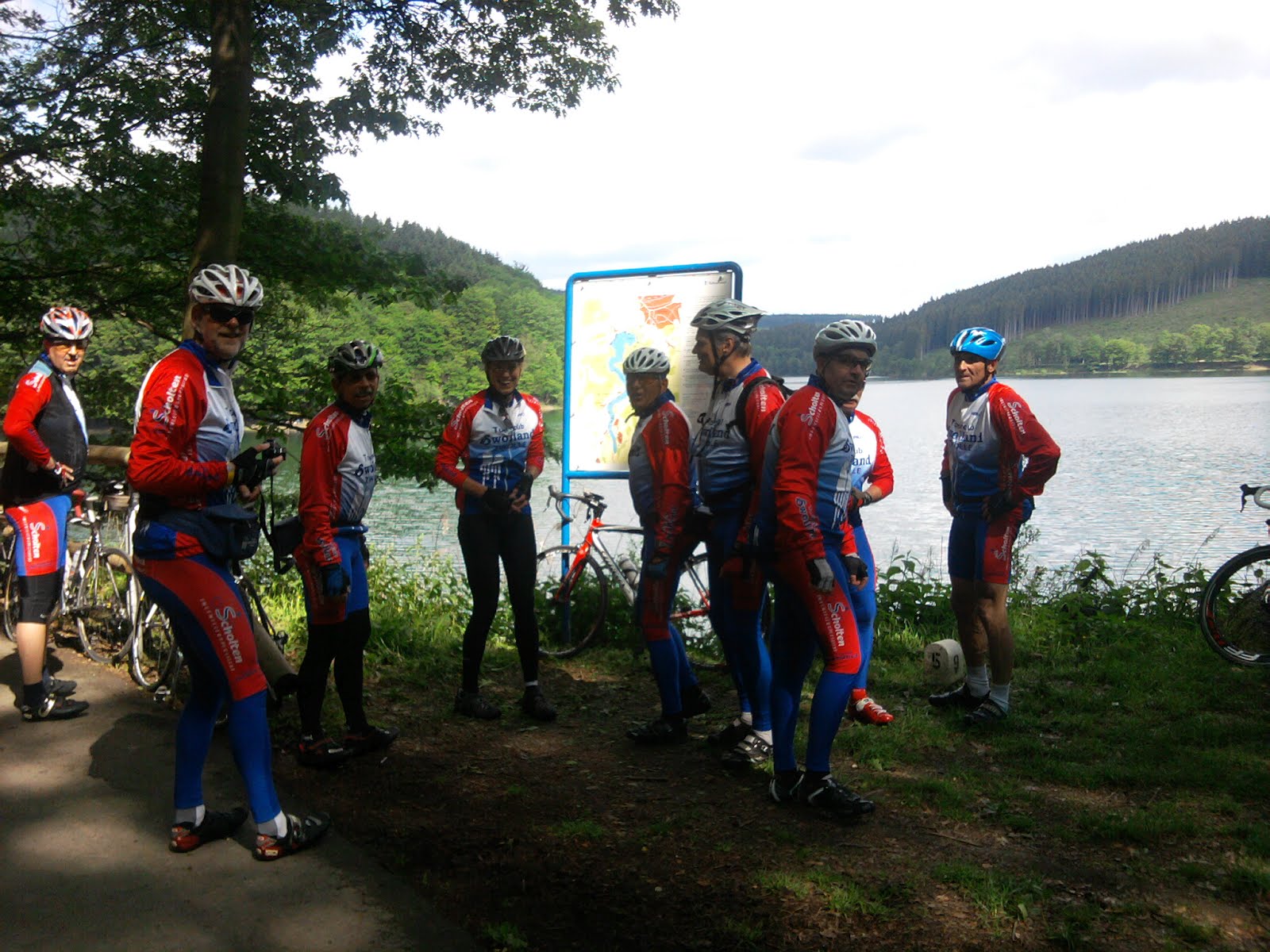 Na 20 km komen we aan bij de Hennesee waarlangs een prachtig kilometers lang fietspad is aangelegd, continu hebben we een prachtig zicht op het meer en z’n geweldige omgeving. Terwijl wij daar zo fietsen horen we meerdere keren geweerschoten uit de omringende heuvels komen en ik neem me voor om, zodra we een fotostop maken, eerst te controleren of we het alle twaalf overleefd hebben. Gelukkig komen we allemaal ongeschonden aan bij een informatiebord waar we de foto besluiten te nemen. Als we later op de dag een dode eekhoorn op de weg aantreffen weet ik wel meer……….