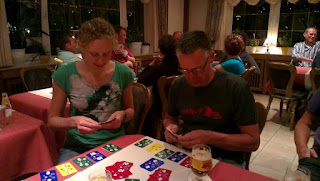Ook de tweede avond zit de stemming er weer goed in en de glazen Warsteiner zijn bijna niet aan te slepen. In de loop van de avond leer ik van Jeannette een nieuw spelletje, Ligretta genaamd. Na een korte leerfase blijk ik een natuurtalent want achtereenvolgens Jeannette zelf, Erik B. en Jaap L. worden van tafel gespeeld. Dat ik daarbij de spelregels zo nu en dan wat ruim interpreteer mag de pret net drukken……..elleboog op tafel, stift !