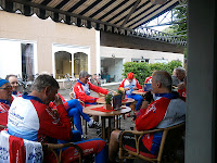 Na een kilometertje of 45 en 800 hoogtemeters rijker komen we weer aan bij het hotel waar de fietsen worden schoongespoten en de tap wacht, inmiddels zijn ook Henk van G. en Hans M.(alias 3e Hans)gearriveerd en is de club compleet.